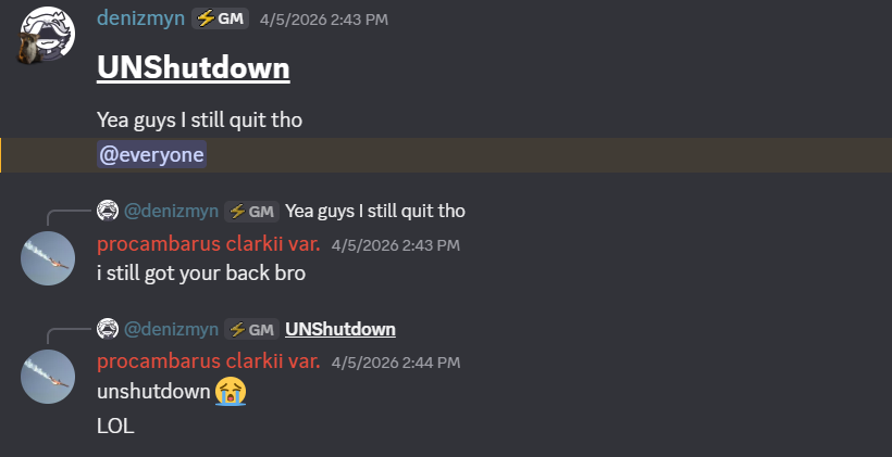 On April 3rd, Denizym unexpectedly announced the shutdown of the Abyssal Tides. The decision was met with mixed reactions internally—while many members were saddened, others, including Elite888 and Mafia, expressed frustration. Due to the backlash, the shutdown was ultimately reversed, though Denizym stepped down from his role as commander.