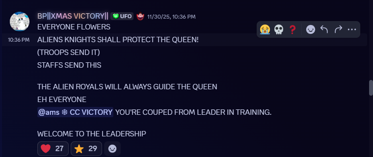 On November 30th, 2025, Ams was officially named the Aliens’ 12th leader at a recent event, marking the start of her leadership and a new era for the army. The Aliens maxed a total of 50 troops on, celebrating this massive induction. The announcement was delivered by BestPenguin, welcoming Ams to the leadership alongside him and Riffy.