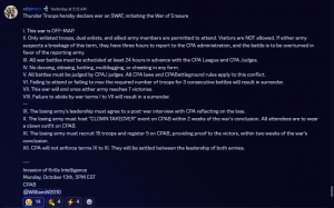 On Friday, October 10th, Thunder Troops officially declared an off-map war against SWAT, called the War of Erasur. This marked it as the first-ever TT War declaration in more than a decade. The first war invasion is the Invasion of Krill’s Intelligence, which will mark the start of a brilliant conflict between the two.