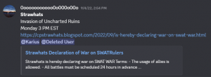 Each army had different reasons for declaring war, but they shared common concerns: SWAT was harboring individuals linked to the Recon Federation and was mistreating its former staff and veterans. The Ice Warriors accused the agents of attempting to stab them in the back and used their declaration post to announce the end of their alliance.