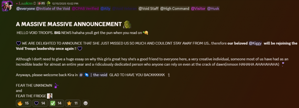 Many expected the Void Troops to be in a stable position following the completion of the Divine Reckoning II war, as well as the shutdown of the People’s Imperial Confederation. With their two largest enemies either defeated or completely eradicated, VT could now focus on its internal affairs – recruiting, hiring staff, holding random events, and other such things normal armies do in times of peace. During this time, an announcement was even made by Lawless, congratulating Kira on her return to leadership! Although, something seemed to be missing.