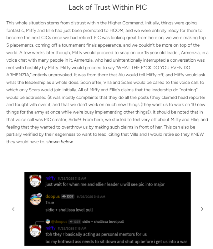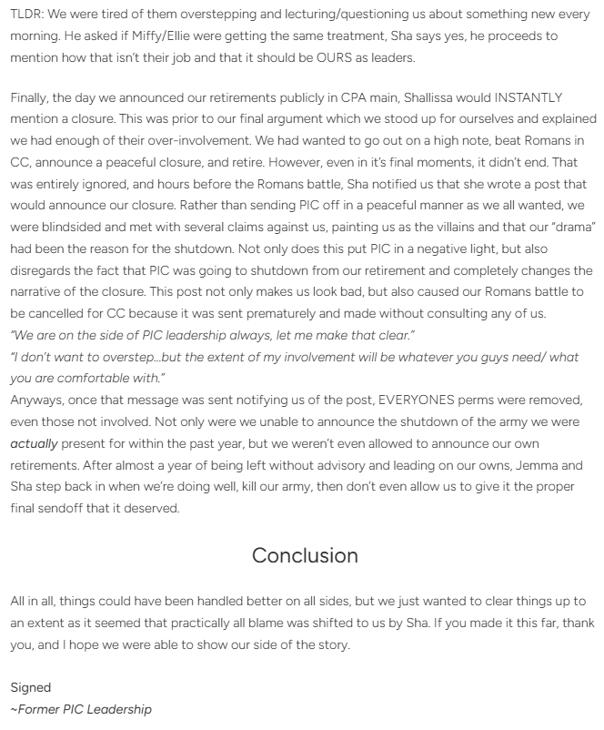 On December 9th, at 9:03 am EST, Shallissa released a follow-up post going in detail about the series of events that occurred. She reaffirmed that autonomy in PIC’s leadership was respected and that things only took a turn once some controversial messages in army group chats were received, which ultimately led to an investigation by the First Secretary. These findings led to a series of conversations between them and the leaders about the misconduct.