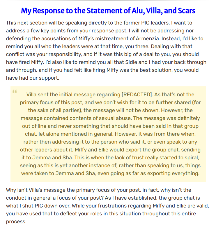 The latter segments of Shallissa’s post were a direct response to the post by Scars and the rest of the leaders. To not just repeat what Shallissa wrote, essentially, she expressed on one of the key points in Scars’ post about Miffy and Armenzia’s altercation that as leaders they should have the authority to fire Miffy if her behaviour was inappropriate. The blame shift towards Shallissa as expressed by her was deemed unjustified, and further points to the autonomy of the leadership.