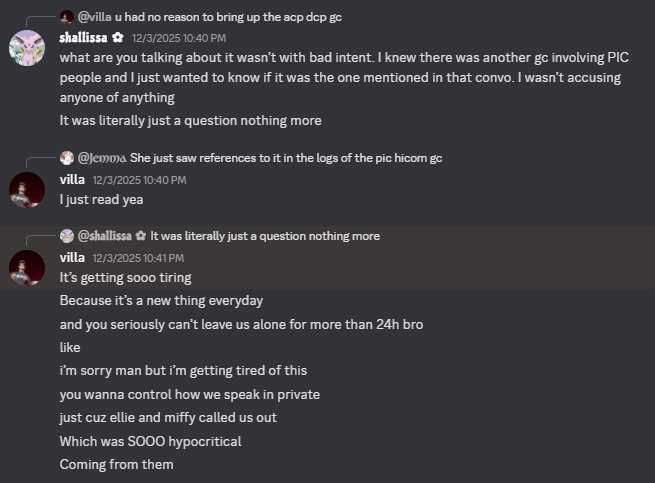 Things remained civil and calm, up until the start of December where new leaks were received, this time in a non-PIC group chat. Shallissa then further tried contacting the leaders about the situation, and to address these incidents that could harm the legacy of the army. Further back and forths led to an overall breakdown between the two parties, as leaders were annoyed by the over-involvement by Shallissa and Sidie, and Villa abruptly stated he would be stepping down after Christmas Chaos.