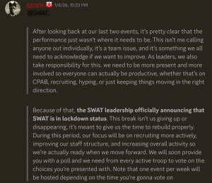 xDemon: simplest said, the original intent was just me joining for a month to put everything together and set SWAT up for 2026. Once I felt like i’d accomplished that, having bought in a full HCOM and Staff team as well as leading the army to maxing 15+, i retired and handed leadership off to Ggogle and Fwapo