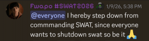 Fwapo: I think its best if SWAT shuts down, its only too long before things die and I think its time, who knows maybe some time in the future will open again and we will see legends leading it.