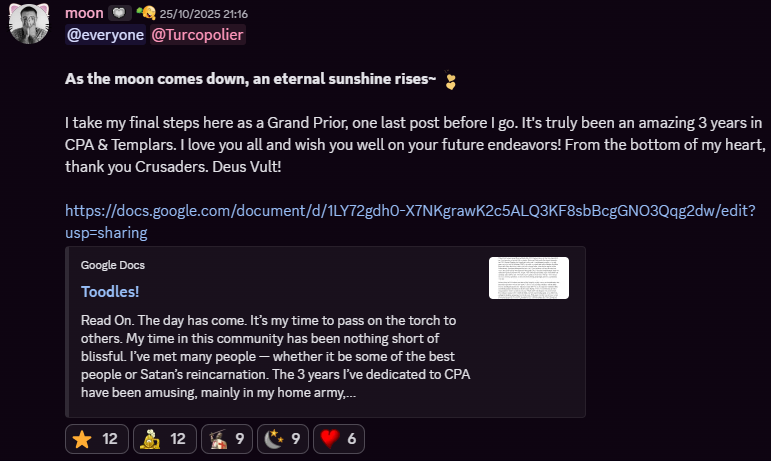 Following her retirement on June 5, 2024, citing college as the reasoning behind her stepping down, Moon would return once more to claim the crown of Grand Prior. Being brought in to once more stabilise the army, she did not intend to stay for too long, yet continued to show her leadership prowess in guiding the Knights through Christmas Chaos XIV and Legends Cup XV. Recently, on October 25, 2025, Moon posted an announcement in the Templars Discord server detailing her immediate retirement from Templars after 3 years of being in the army. She gives her love to the army, then commands both troops and the new leaders, Borapenguin and Zez to treat each other well – specifically mentioning the latter two to “lead as if you were bound together by the heart and soul”.