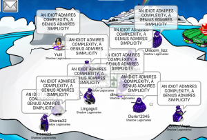 [Additionally; Two of the Water Vikings‘ events in Club Penguin Journey were deemed invalid due to them taking place in a party and/or usually crowded room, such as Town. Other examples to avoid would be the Welcome Room, Iceberg, and Cave]