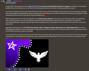 On April 27th, 2025, the Void Troops opened their doors by Logical and Kyle104 after a massive internal split in the Doritos of Club Penguin. The army started off on a bumpy ride, winning major conflicts against the Special Weapons and Tactics, Penguins of Agartha, and soon enough DCP in just the first month.