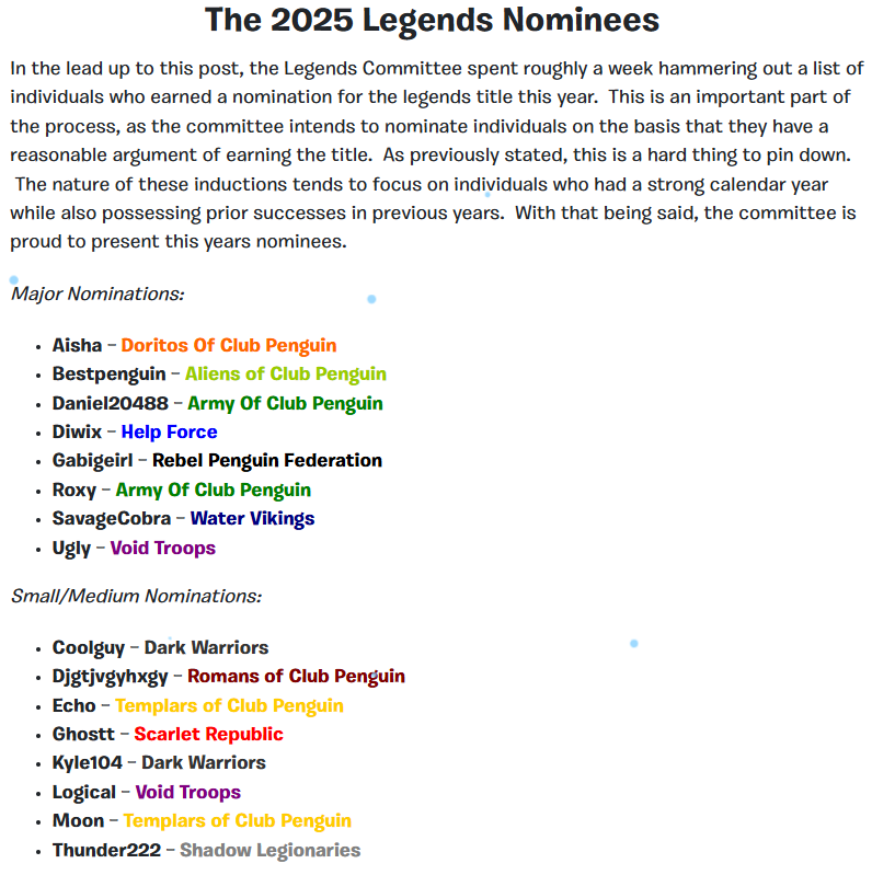 On December 20th, the Legends Committee officially announced the legend nominations for the year 2025. DMT mentioned in his post that the community nominations will go back to how it used to be in 2022 and prior, as voted on by the committee. What it means is if any nominee passes 55.5% yes votes, they will be given the +1 community vote. It was also mentioned that Orange will abstain from his Committee Head role due to time constraints, and that Iceyfeet1234 will take his spot for this year.