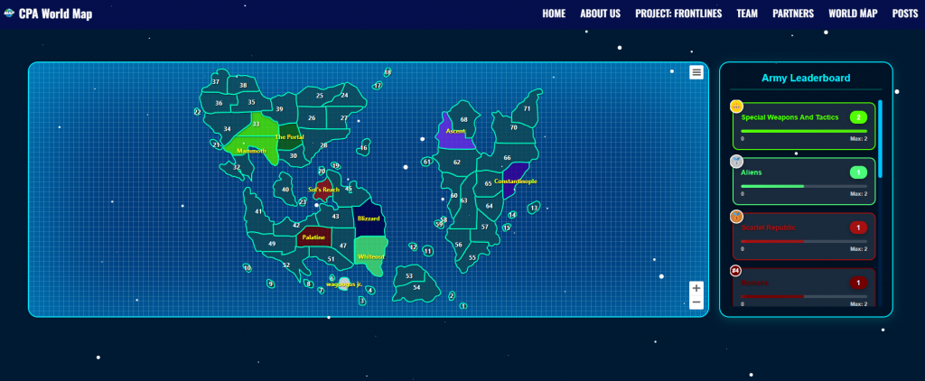 The biggest takeaway from this project is the adjacent land rules, as well as seasons every four months, with the inclusion of a new map with each new season. There has been a lot of great and positive feedback towards the World Map, as a total of 9 armies have marked their capitals on the map. Many armies have already begun their expansion on the map, such as the Special Weapons and Tactics and Scarlet Republic.
