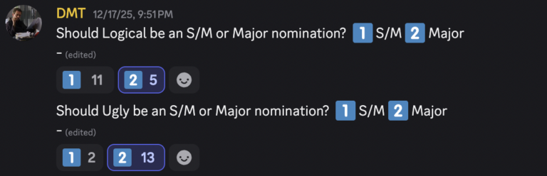 The nominations this year are noticeably fewer in number, with only 8 major nominees compared to 13 last year. However, the S/M nominees see higher numbers, with 8 nominees, compared to 6 last year. Additional votes between the committee were also present, regarding the nominees, Ugly and Logical, being put in separate categories as the post goes in detail about it.
